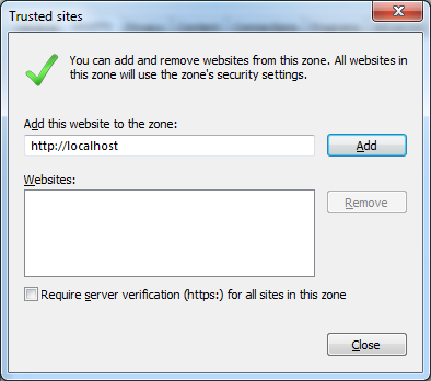 After setting Pop-ups to open in new windows, you need to add site you are going to test as trusted site. To do that, open Internet Option and then Security tab.
