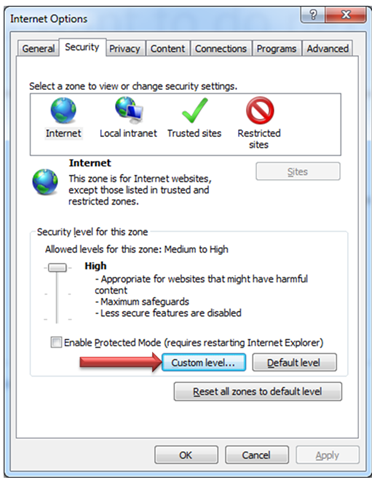After performing this task, you need to make sure that JavaScript is enabling in the browser. For that open Internet Option and select Security tab. In Security tab click on the Custom Level.