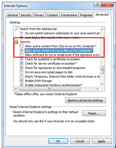 Last step is to make sure that active content can be run from the local file. To do this go to Internet Option and then select advanced tab. In Security section check the check box of Allow active content to run from local computer.