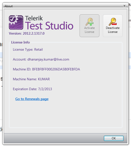 After successful activation you will get above message. If you are running Test Studio as trial then you can activate it later as well. To activate it later launch Test Studio and click on the Help menu. In Help menu select View from About tab.