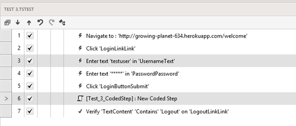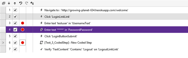 As we see step 6 is a Coded Step. We need to debug this step. To being with we cannot debug a particular line of coded step in Test Studio desktop version. In Test Studio desktop version we can put breakpoint to debug only at Test Step level. So we can put a breakpoint on Test Step as given below. Test Studio will wait for user at step 3, 4 and 6.