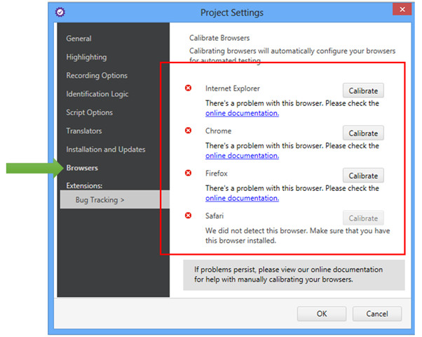 In Project Settings you will get option Browsers. In that you can see a message below each type of browsers that “There is a problem with this browser”