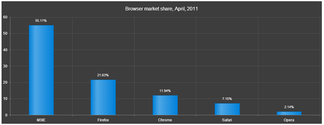 For the sake of this blog post i am going to fake some data about browsers market share. So initially i will show column chart for major browsers. Then on clicking each column i should be able to drill down into its specific data. I will create my data as a JavaScript array and use them for binding to chart. Here are my data array which i will use while binding to chart: