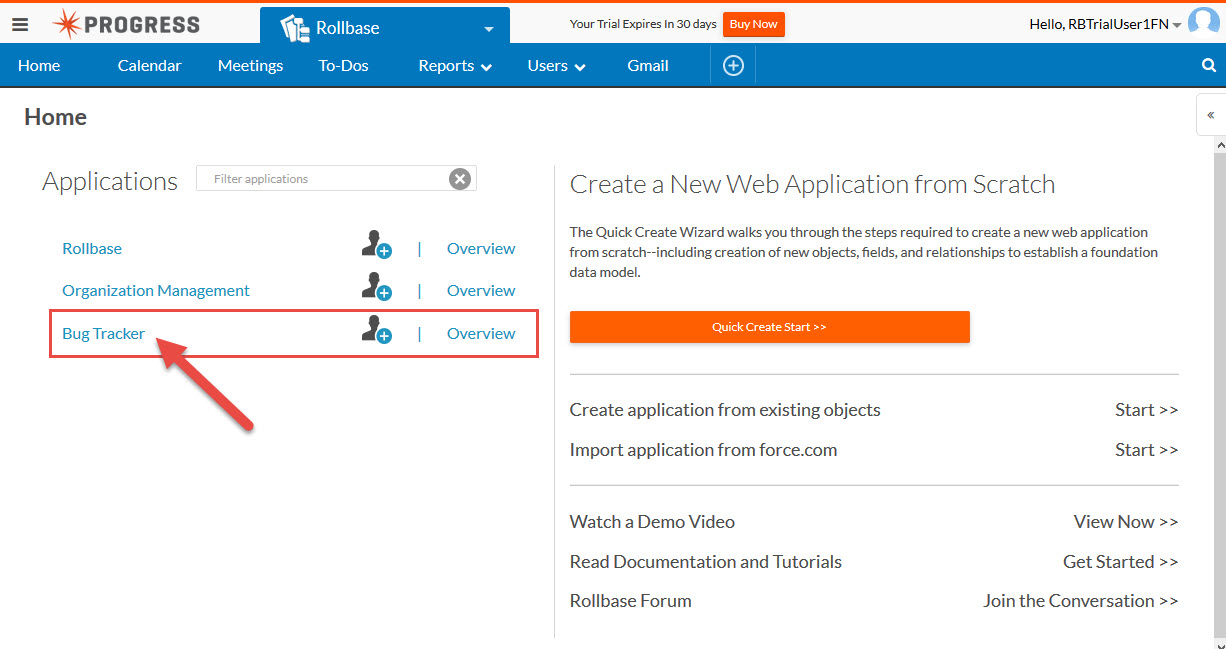 If you have finished sign up for a Rollbase hosted trial account, log in to your account with your credentials. You can go to http://www.rollbase.com and look for the “Log in to Rollbase” link and click it.