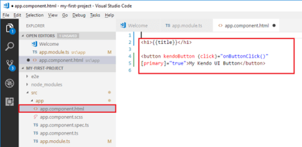 Now we will add an input button from Kendo UI. Update your view file from path ‘src/app/app.component.html’ with the following code:
