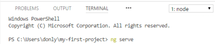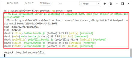 After this again run 'ng serve' or 'ng serve –open' it’ll start listening our request on a default port 4200 in windows. We can change it if this port is busy by using command: 'ng serve –port <1234>' 1234 is any free port.