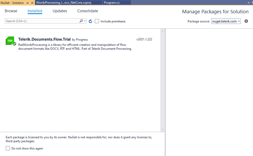 First, you need to to install Telerik.Documents.Flow NuGet package see below picture where I am using Trial version of Telerik.