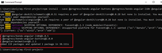 npm install --save @progress/kendo-angular-charts @progress/kendo-angular-common @progress/kendo-angular-intl @progress/kendo-angular-l10n @progress/kendo-angular-popup @progress/kendo-drawing hammerjs @progress/kendo-licensing