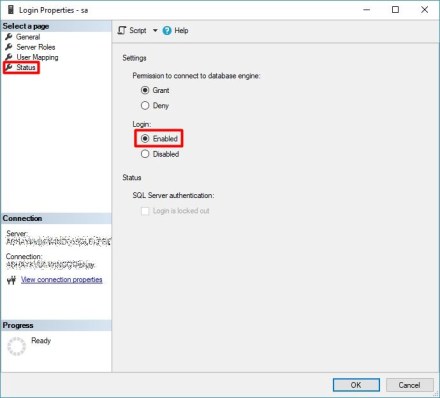 You can try re-connecting to the server with this newly enabled login, or the one you create. Click File > Disconnect Object Explorer to disconnect. Click File > Connect Object Explorer…, this time, selecting SQL Server Authentication in the Authentication drop-down menu. Enter sa as Login, and the password you chose earlier as Password.