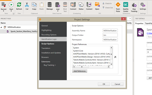 Okay let’s start with the test oracle. The test oracle is an external assembly that you are going to use within test studio inside your script but this assembly is going to be created by someone else. So what i had gotten done was to call the SOAP API using a visual studio function of adding web service reference and created that project as an assembly. Now the next step would be to add that assembly in test studio so if you go to your project and go to settings you will have a section that says script. Now within this section you will notice some assemblies that are automatically referenced here. Now if you notice this reference, this is something that has been added as a custom reference and this is where my test oracle has been created. So this assembly uses a simple function to invoke the SOAP API and provides a simple programmatic interface to invoke this soap service. So if you want to add more test oracles or external assemblies you can click on add reference and that’s what allows you to refer any .NET based assembly. So that takes care of the first step which is of getting a test article in place.