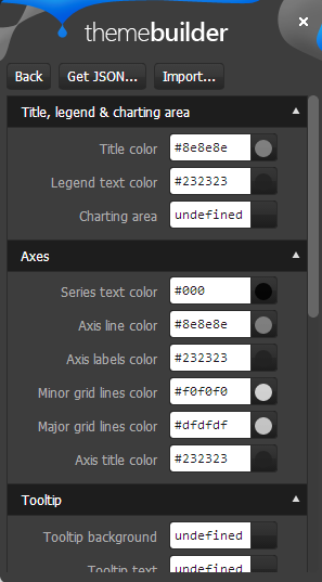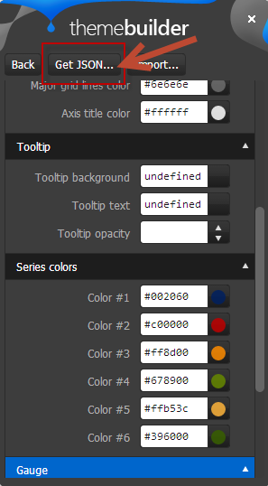 Like this you can set your custom colors for all the customization points available for the widget. - Once you are done with your changes, click on the “Get JSON” button available on top of the GUI tool. This will spit out a JSON structure of the changes you just did.