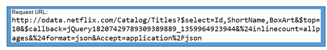 url: "http://odata.netflix.com/Catalog/Titles?$select=Id,ShortName,BoxArt&$top=10",
