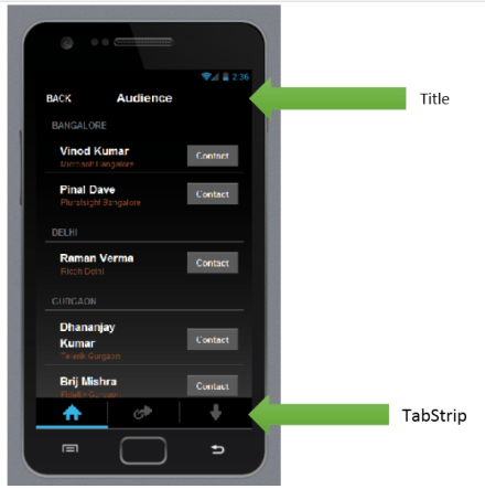 Above we are changing default tabstrip behavior for Android and forcing it to be in bottom. To display view-title we are setting visibility of view-title for android as true. Now on running application you will find tab-strip in bottom and view-title visible for android.