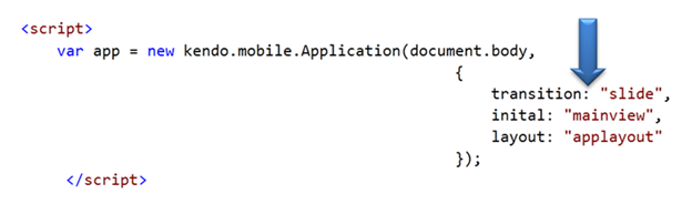 var app = new kendo.mobile.Application(document.body, { transition: "slide", layout: "pageLayOut" });