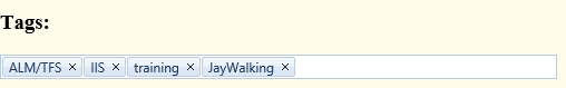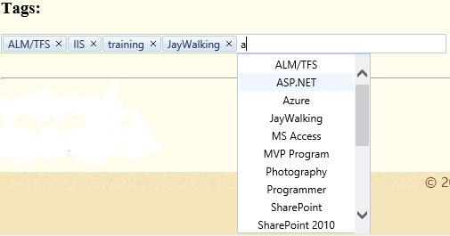 protected void TagsAutoCompleteBox_DataBound(object sender, EventArgs e) { var sessionTagsX = (from st in ndx.SessionTags where st.SessionID == Convert.ToInt32(SessionID.Value) select st).ToList(); for (int i = 0; i < sessionTagsX.Count; i++) { TagsAutoCompleteBox.Entries.Add(new AutoCompleteBoxEntry(sessionTagsX[i].Tag.TagName, sessionTagsX[i].TagID.ToString())); } } - To add an entry we just start typing and the list would be populated automatically. We can either select from the list or just type in the whole tag.