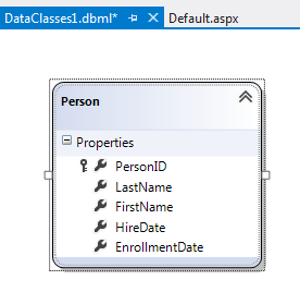 Next drag and drop Tables, Views , Stored Procedures and Functions from Server Explorer on dbml design surface to make a part of data model. In this case , I am going ahead with only one table Person. Now you can see that Person is added on dbml file.
