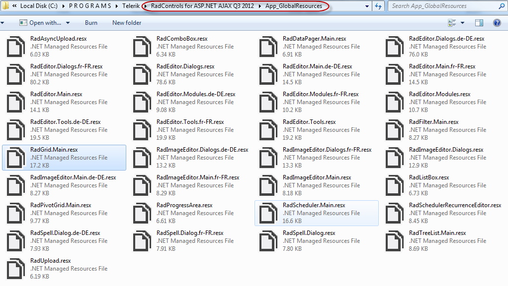 When you download and install the RadControls for ASP.NET AJAX, we also ship resource files for all our controls and is installed in “App_GlobalResources” folder. Below is a screen shot of the resource files installed on your hard disk: