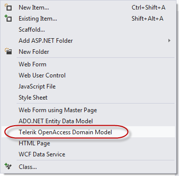 Open Default.aspx and add a RadGrid from the toolbox. We will bind the grid to Products table from Northwind database. We will make use of OpenAccess to create a Data Model or Domain Model and OpenAccess Data Source for data binding. If you are not familiar with OpenAccess, it is a free ORM tool from Telerik. I encourage you to download and play with it. Add a new item to the project of type “Telerik OpenAccess Domain Model”.