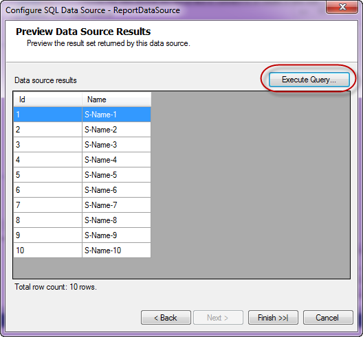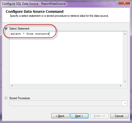 | <SqlDataSource ConnectionString="stagingdb1" SelectCommand="select * from contacts" Name="ReportDataSource" /> | |