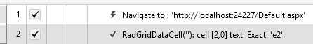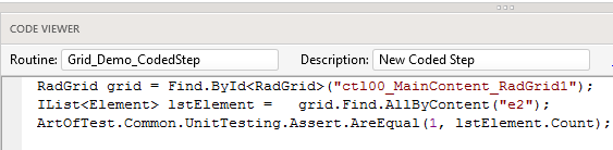 In above coded step, we are finding reference of Grid then searching Employee ‘e2’ in whole grid and then asserting if count is equal to 1 to verify existence of Employee e2.