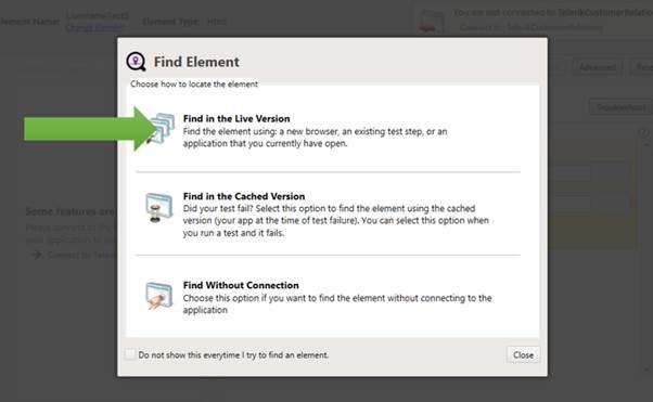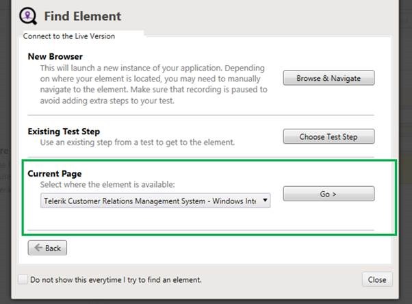 Let us Find Element in Live Version. To find element in Live Version make sure that application is already open in browser. Since already application is opened here so select open Current Page and select application from drop down.