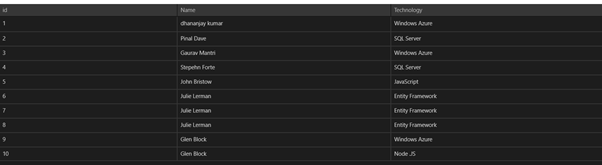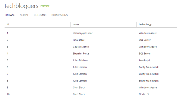 We are going to display data from techbloggers table. I have created this table in Windows Azure Mobile Service as shown below. There are three columns in table. We will display content from techbloggers Mobile Service table in RadDataGrid.