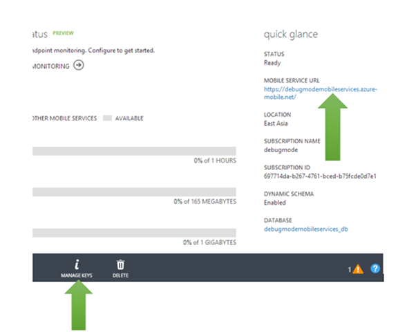 We need App URL and key. You need key and application URL to work with Mobile Services from Windows Store application. You will find key and application URL at the portal.
