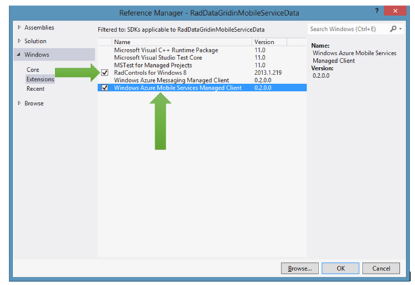 Now go ahead and create a Windows Store App by choosing Blank App project template from Windows Store project tab. After project being created add Rad Controls for Windows 8 reference and Windows Azure Mobile Services Managed Client reference in the project. To add reference right click on Reference in project and select Add Reference.