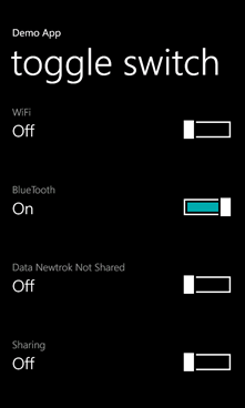 While adding RadToggleSwitch we can configure value of header. If needed, you can define HeaderStyle and HeaderTemplate specific to your application. By default accent color of device get applied as background color of RadToggleSwitch. You can set IsChecked property to either true or false. If you do not set it then it takes default value false. One important property is ButtonStyle. You can configure this property to give different look to toggle button.