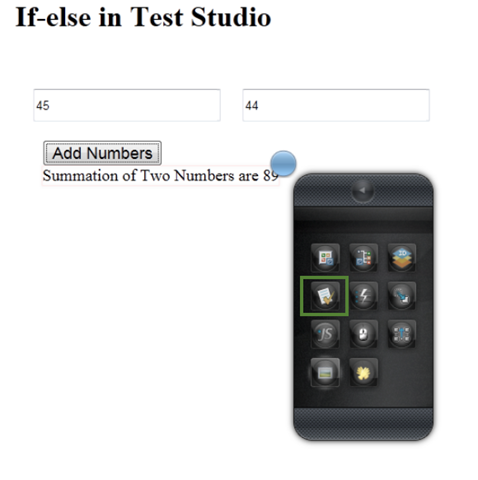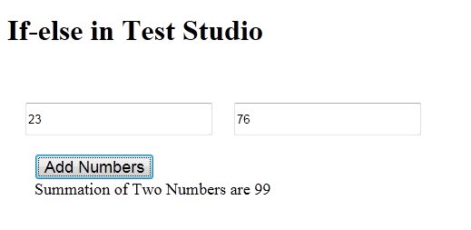 We will understand working with Logical Steps in Test Studio using a Test Scenario. Let us suppose you have a Web Application as following. User will enter numbers in text input and click on the Add Numbers button to get the summation of two numbers. Summation of numbers are displayed in a span.
