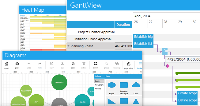 This control as the name goes, allows you to visualize and manage hierarchical project data as a Gantt Chart. This has the capability to visualize different types of project data such as Tasks, Milestones, Summaries, and also the relations between them. You can highlight different types of important items like late or critical tasks. Another feature of the control is the ability to import data from your MS project and visualize it in a friendly way.