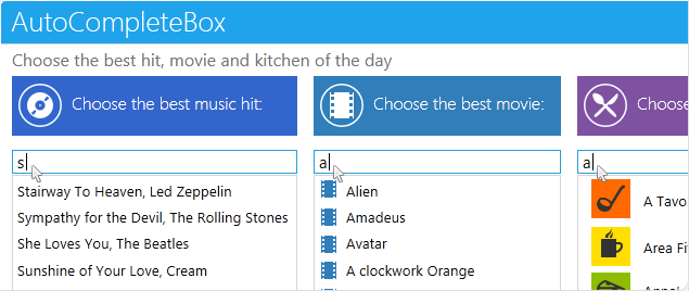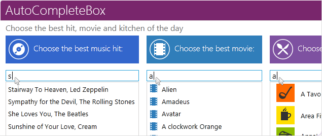RadAutoCompleteBox control gives you immersive experience as following. It can be bind to data source as simple as collection of strings or collection of complex objects. In below RadAutoCompleteBox SuggestionSource is of complex objects.